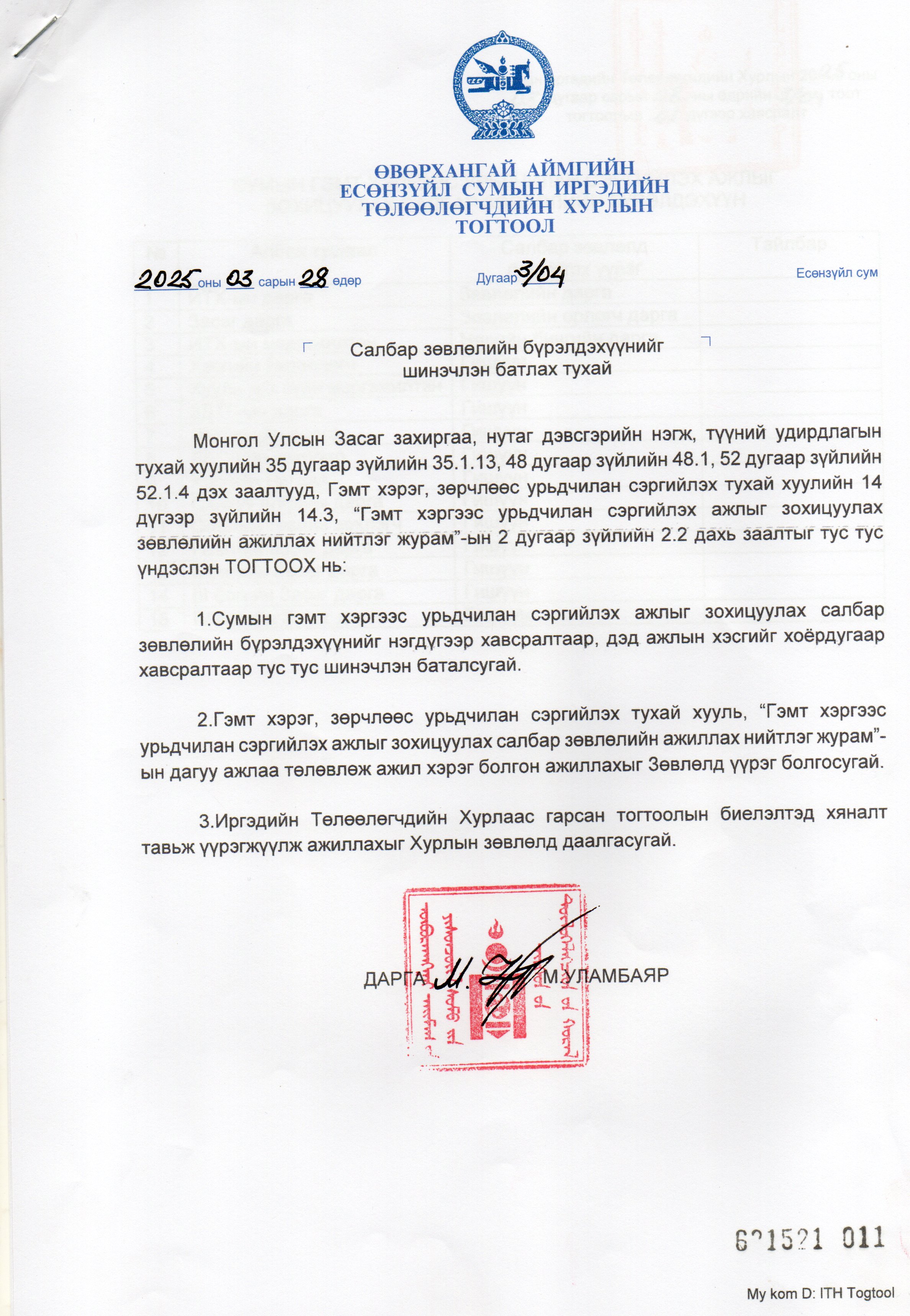 Салбар зөвлөлийн бүрэлдэхүүн шинэчлэн батлах тухай